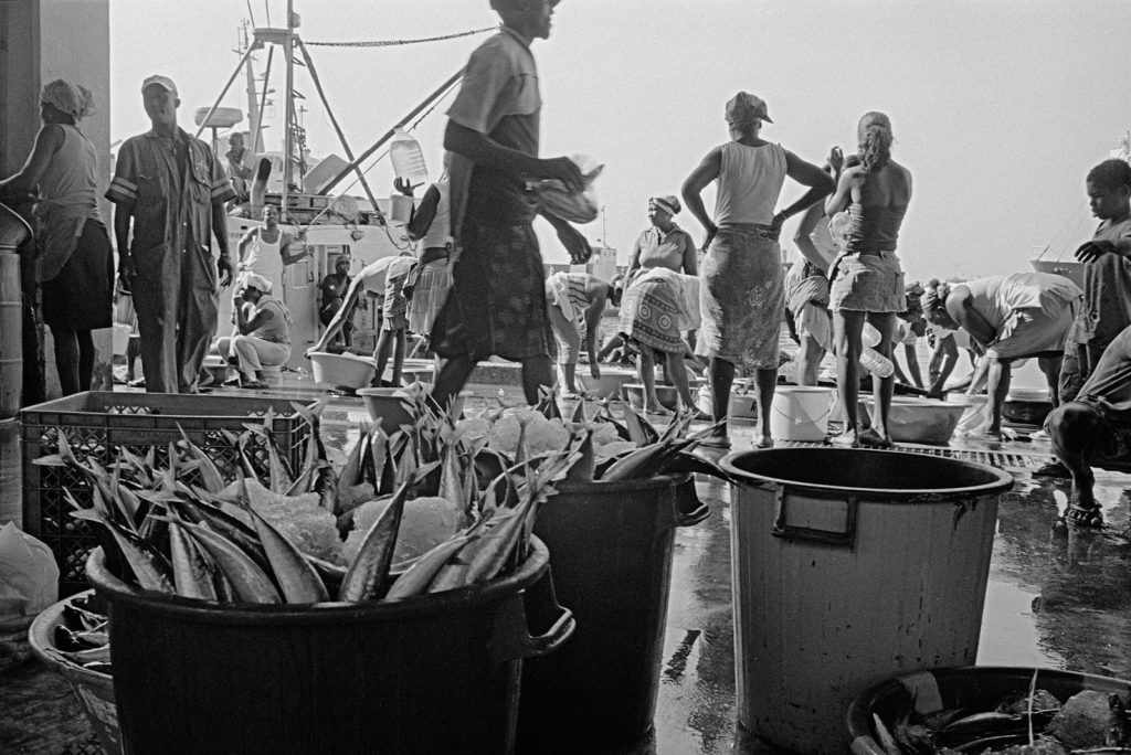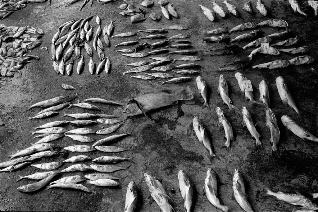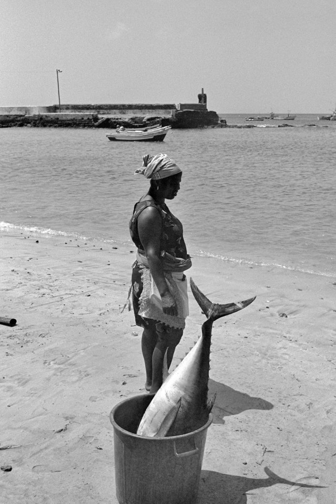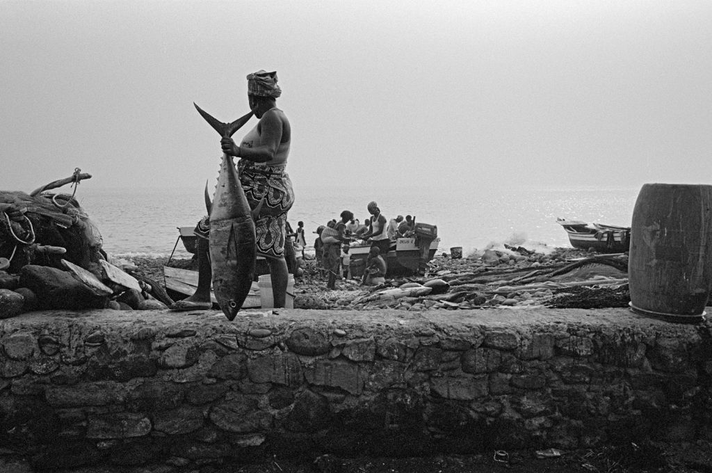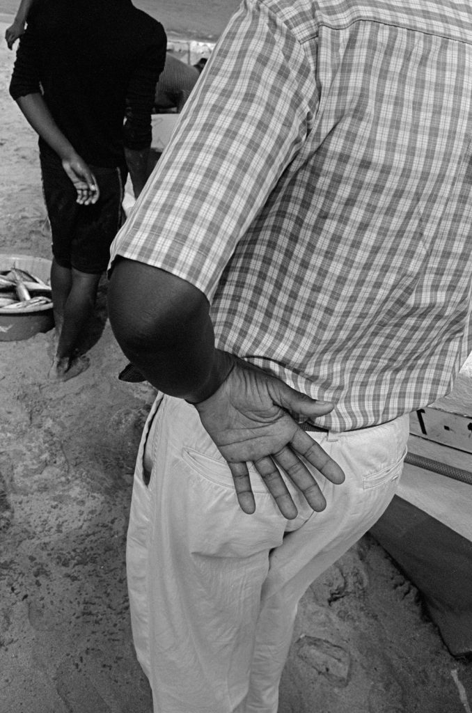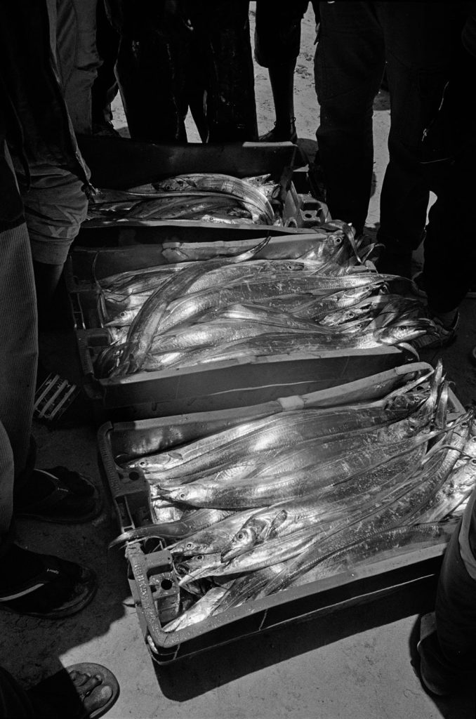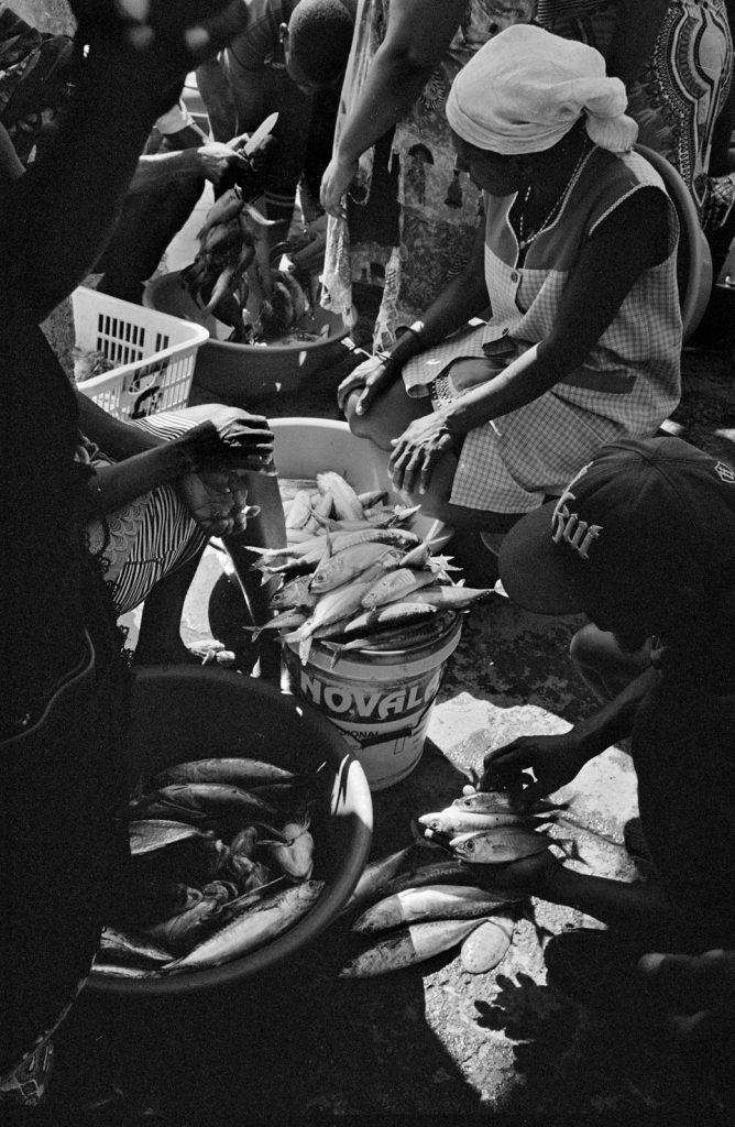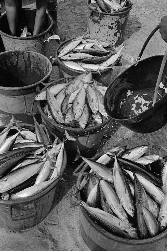 « Le poids pas bon pour l’homme », me dit celui qui refusait que je le photographie portant, amortie par une couronne de mousse sommairement posée sur sa tête, un bac de 70 kgs de sardines, d’un plastique aussi triste et gris que fonctionnel. Le cou et le dos brisé, ses jambes ne le portant plus, cet homme cassé, le corps usé par tant de courses, se préservait d’une dignité perdue.
