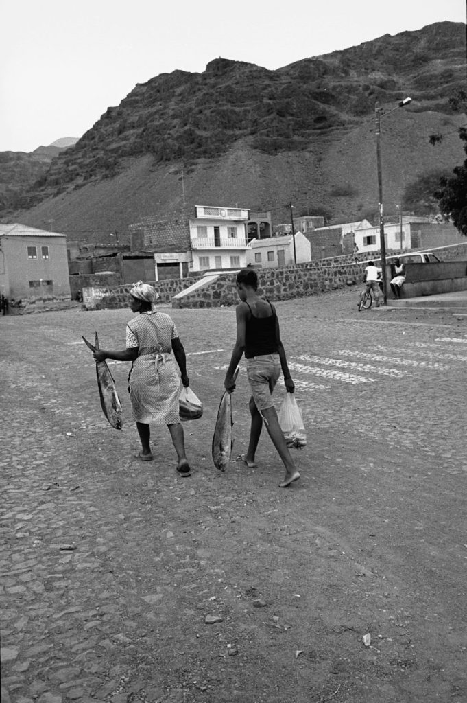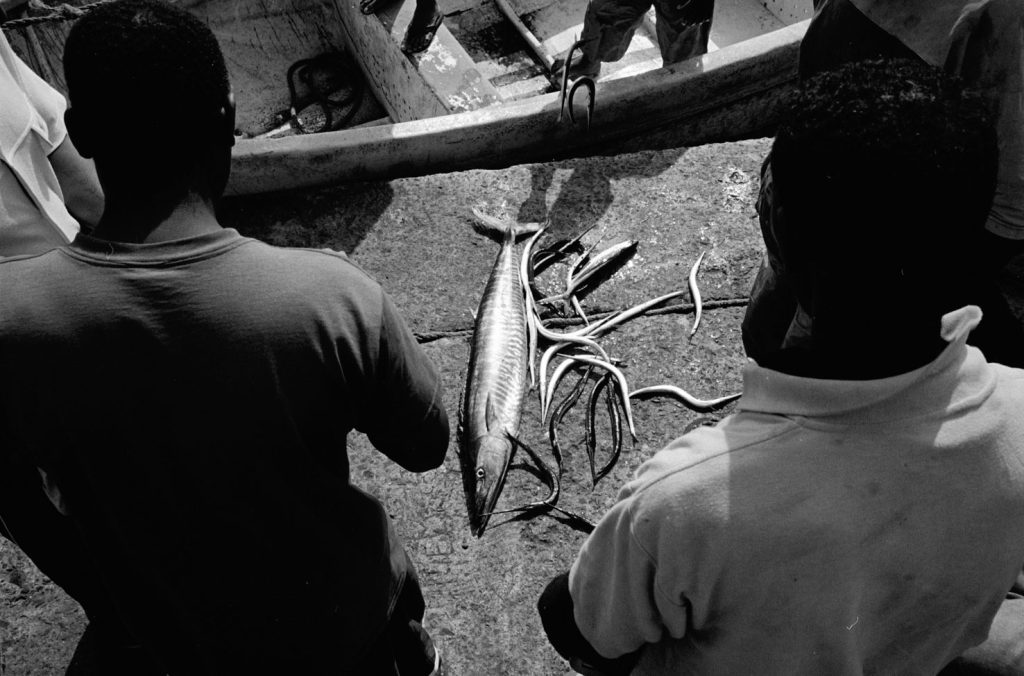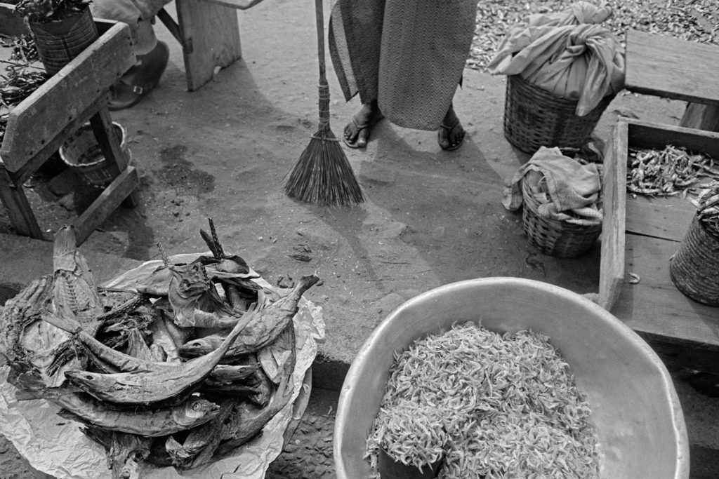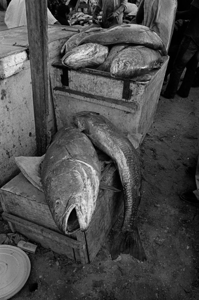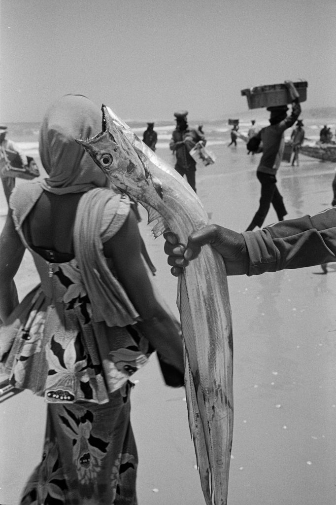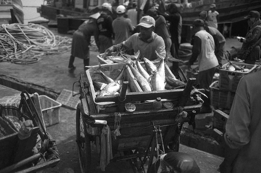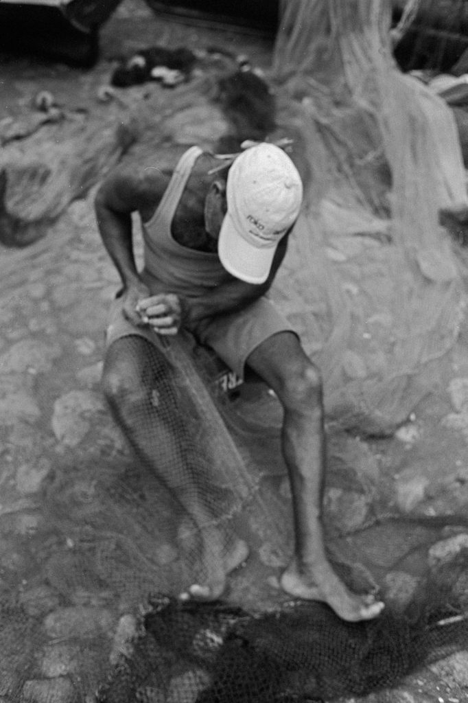 « Le poids pas bon pour l’homme », me dit celui qui refusait que je le photographie portant, amortie par une couronne de mousse sommairement posée sur sa tête, un bac de 70 kgs de sardines, d’un plastique aussi triste et gris que fonctionnel. Le cou et le dos brisé, ses jambes ne le portant plus, cet homme cassé, le corps usé par tant de courses, se préservait d’une dignité perdue.