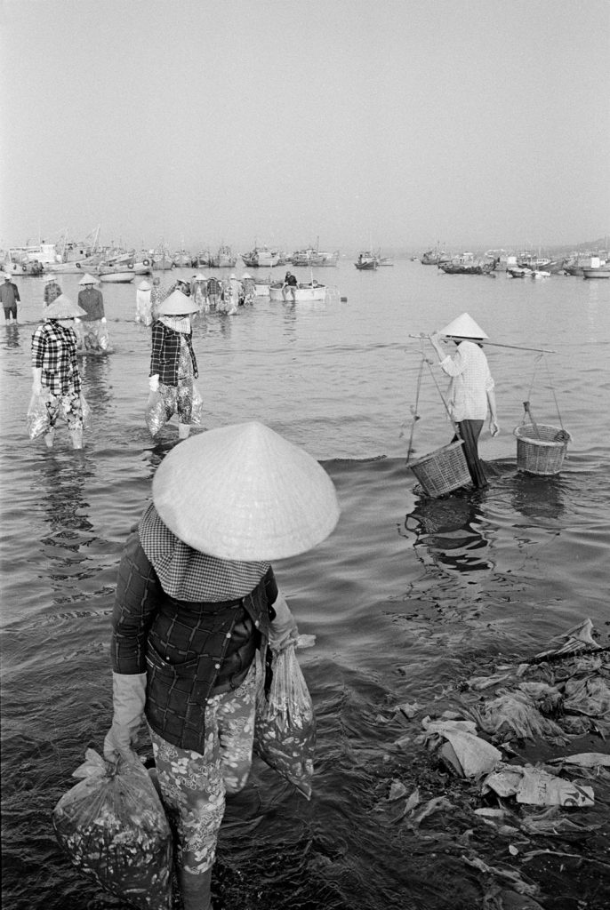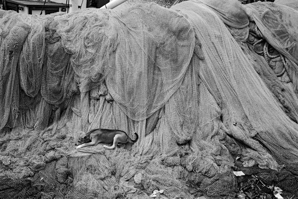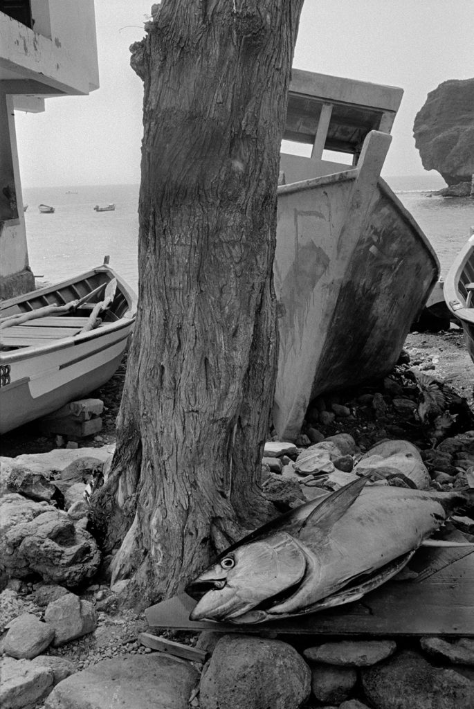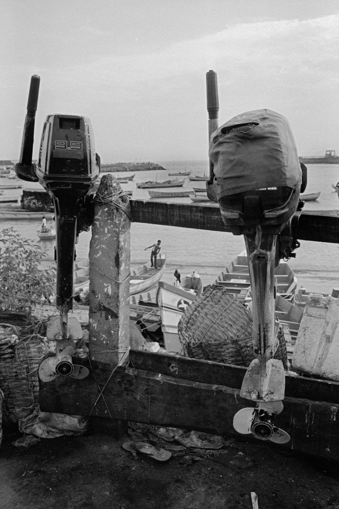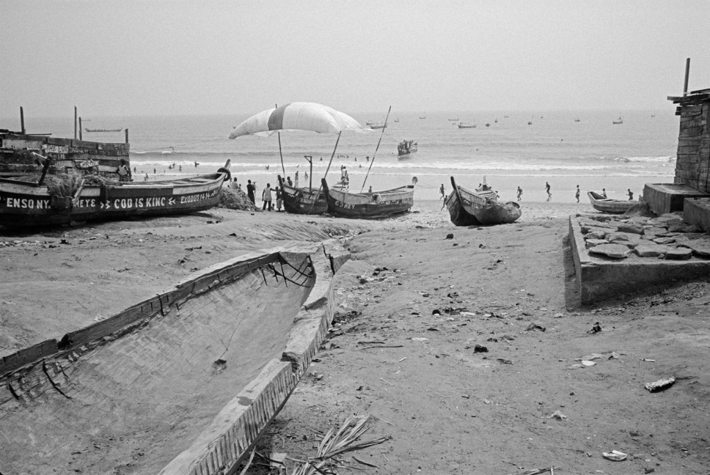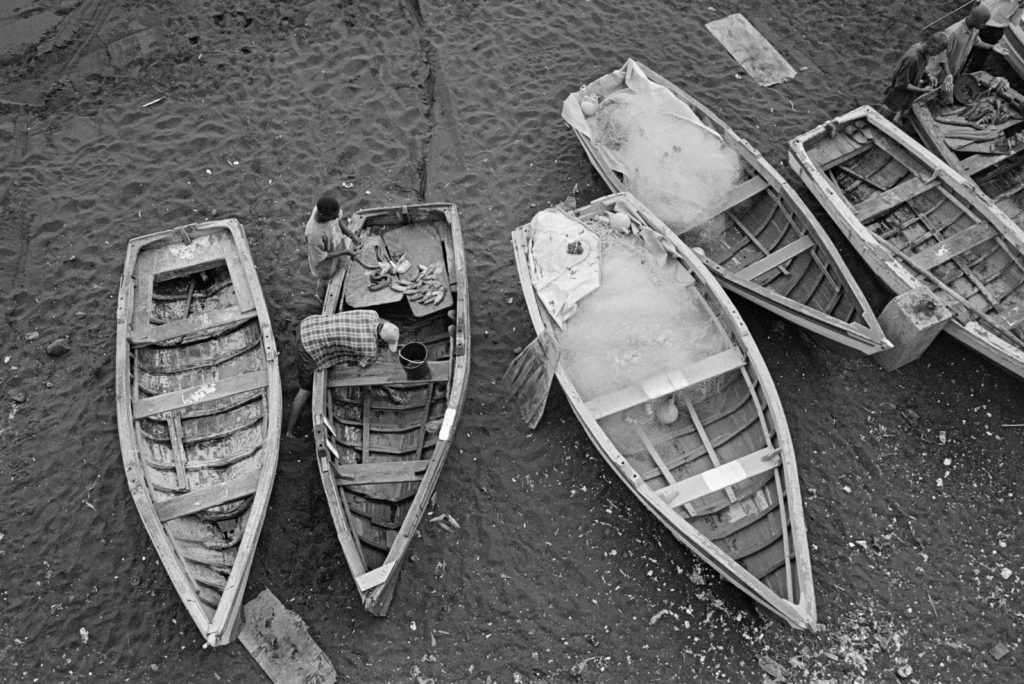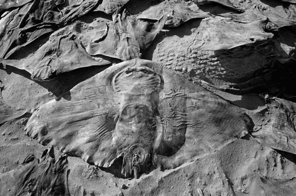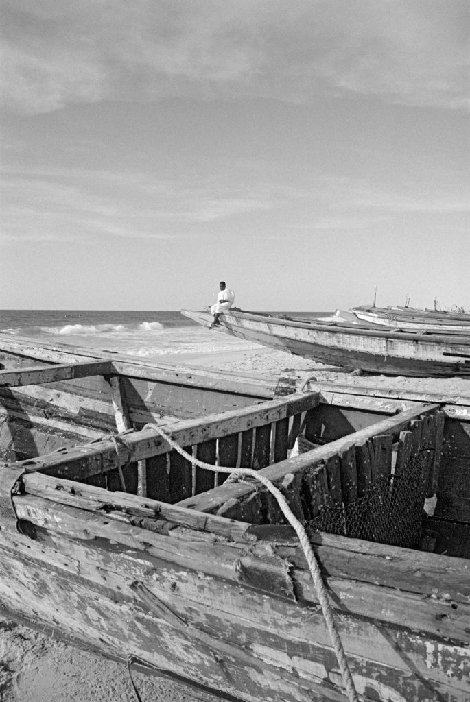 Un village fantôme, bidonville de bord de mer, d’un passé récent est venu se poser sur cette fin de terre. Les pêcheurs ont bâti des abris de fortune pour se protéger des vents qui les saoulent et vivent sous des toits de vieux plastiques amalgamés et de filets en fin de vie. Au sol, déchets et immondices courent jusqu’au loin, là où la ligne des barques danse sur l’horizon.